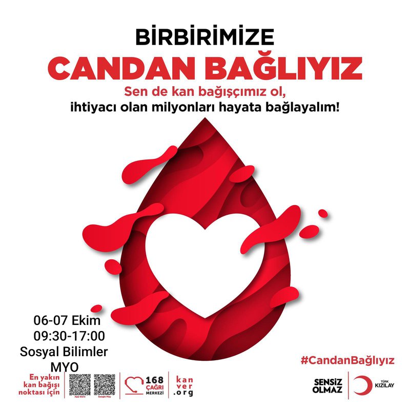 02.05.2007 tarihli ve 26510 sayılı Resmi gazetede 5624 kanun numarası ile yayınlanan Kan ve Kan Ürünleri Kanunu doğrultusunda Türkiye de ihtiyacı olanlara kan temin etme görevi öncelikli olarak Kızılay Kan Merkezlerine verilmiştir. Bilindiği üzere kan; kaynağı sadece insan olan , yapay olarak üretilmeyen bir tedavi aracıdır. Bu nedenle Türk Kızılay Gümüşhane Kan Bağışı Merkezi olarak hastalarımızın ihtiyacı olan kan ve kan ürünlerini temin etmek amacıyla 6-7 Ekim 2025 tarihli 9:30-17:00 saatleri arasında Sosyal Bilimler MYO önünde kan bağışı organizasyonu gerçekleştirilecektir. Tüm akademik, idari personelimizin ve öğrencilerimizin kan bağış organizasyonuna destekleri beklenmektedir.