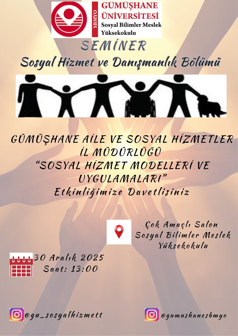 30 Aralık 2025 tarihinde saat 13:00'da okulumuz Sosyal Hizmet ve Danışmanlık Bölümü'nün dış paydaşı olarak belirlenen Gümüşhane Aile ve Sosyal Hizmetler İl Müdürlüğü tarafından okulumuzda seminer faaliyeti gerçekleştirilecektir. İlgili faaliyette sunum yapacak Gümüşhane Aile ve Sosyal Hizmetler İl Müdürlüğü uzmanları sosyal hizmetler alanında sunulan hizmetler konusunda sosyal hizmetler programı öğrencilerine bilgilendirme yapacaktır. Seminerin sosyal hizmetler alanında teorik eğitim gören öğrencilerimizin pratik bilgi edinmesinde ve sosyal hizmetler alanına dair beceri kazanmalarında yarar sağlaması beklenmektedir. Eğitimimize okulumuzda ilgi duyan tüm öğrenciler davetlidir.