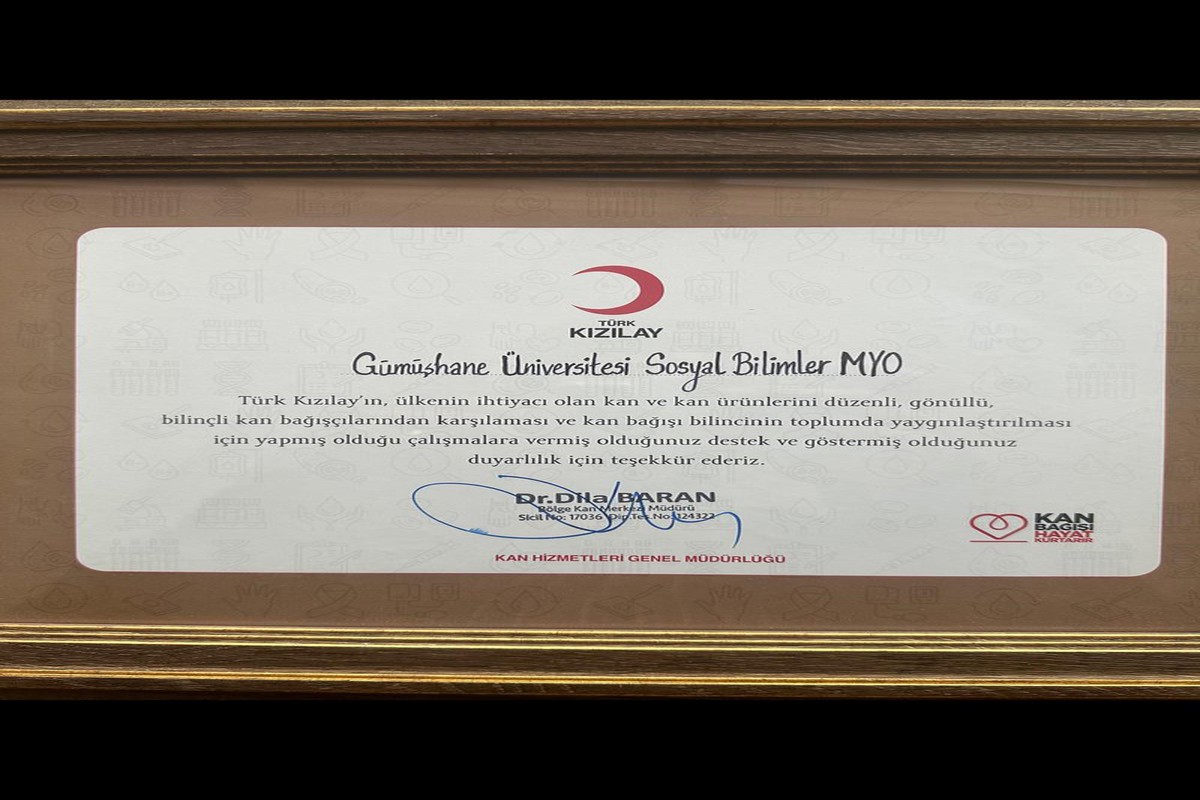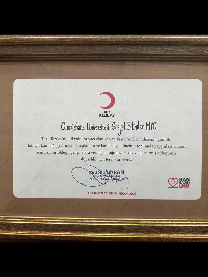 Gümüşhane Üniversitesi Sosyal Bilimler Meslek Yüksekokulu, kan bağışı konusunda gösterdiği duyarlılık ve yürüttüğü başarılı çalışmalar nedeniyle Türk Kızılay tarafından teşekkür belgesi ile taltif edildi.